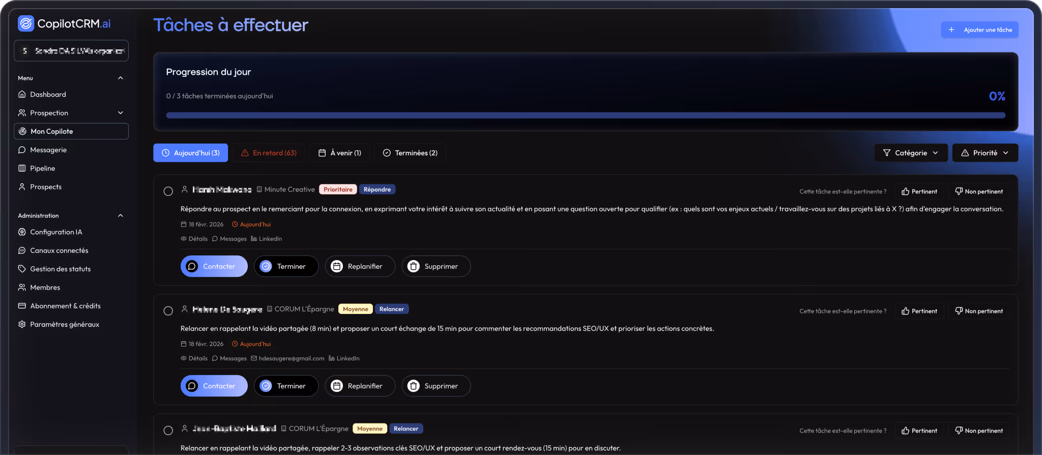 Le Copilot IA analyse les signaux d’engagement : réponses, interactions multicanales, activité récente, statut dans le Pipeline. Ces données proviennent des campagnes de prospection multicanale et des conversations centralisées dans l’Unified Inbox.